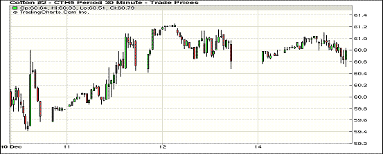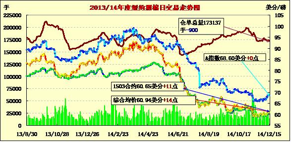 12月15日,棉花市場消息面有限,紐約期棉先漲后跌;主力3月合約結(jié)算價(jià)60.65美分/磅,漲11點(diǎn);1505月合約收于61.19美分/磅,漲12點(diǎn)。當(dāng)日期棉開盤后普遍上漲,午盤過后主力合約跌回上周五點(diǎn)位,盤終近期合約小幅上漲,遠(yuǎn)期1512月-1612月合約普遍下跌;市場成交較前一日明顯減少。下周多國進(jìn)入圣誕節(jié)和新年假期,節(jié)前紡企采購意愿降低,市場成交量將有所下滑。