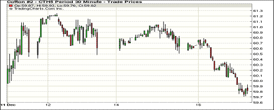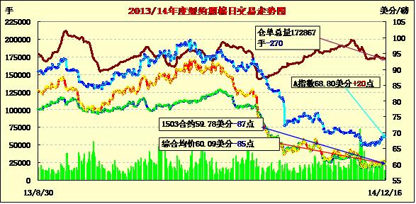 在連續(xù)三個(gè)交易日上漲后,16日紐約期棉止?jié)q回落,跌幅普遍不及百點(diǎn);主力1503月合約結(jié)算價(jià)59.78美分/磅,跌87點(diǎn);1505月合約收于60.38美分/磅,跌81點(diǎn)。當(dāng)日期棉開盤后繼續(xù)圍繞60美分上下震蕩調(diào)整,主力3月合約盤終收于59.78美分/磅,為12月11日以來低點(diǎn),市場成交量上升;外部商品市場玉米和大豆收跌。