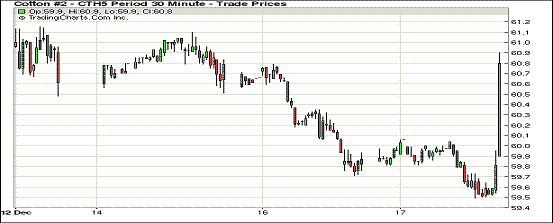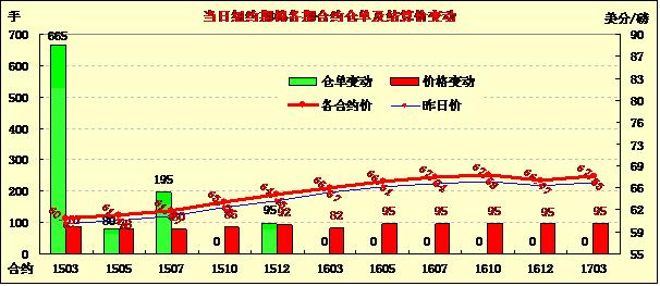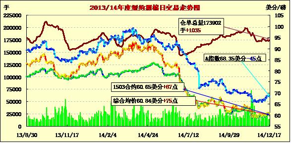 受小麥等外部商品市場期貨上漲拉動,17日紐約期棉再度止跌反彈;主力1503月合約結(jié)算價60.65美分/磅,漲87點;1505月合約收于61.16美分/磅,漲78點。當(dāng)日期棉開盤后繼續(xù)窄幅震蕩,盤終前市場買盤拉動棉價持續(xù)上漲,主力合約最高突破并收于61美分/磅以上;外部市場商品期貨、美股和原油普遍上漲,市場成交量低位運行。國際油價連續(xù)下挫打壓人造纖維價格,棉花產(chǎn)品雖更具競爭能力,但植棉面積和產(chǎn)量不斷上升以及高期末庫存預(yù)期,仍對國際棉價是個巨大壓力。
