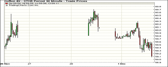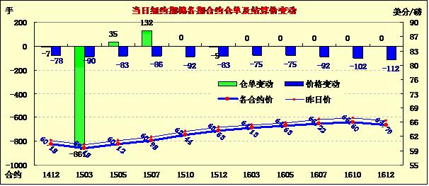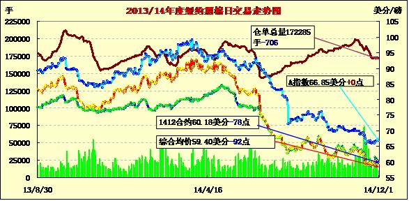 12月第一個交易日,紐約期棉整體收跌,近期12月合約結算價60.18美分/磅,跌78點;主力3月合約收于59.18美分/磅,跌90點。當日期棉開盤后先漲后跌,主力3月合約在60美分上下震蕩,盤終收于60美分以下,其他合約均普遍下跌;12/3月價差100點。隨美棉和印度棉新花上市,全球供需情況不變,棉價仍將維持下跌趨勢。