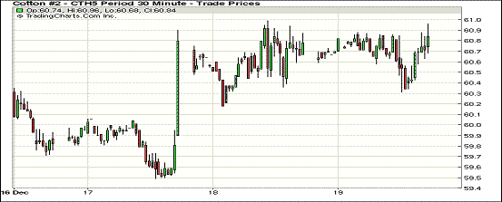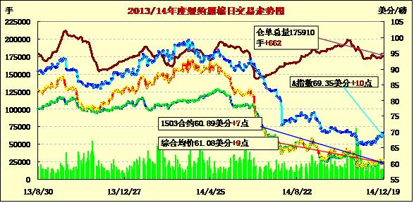 12月19日,紐約期棉繼續(xù)盤中調(diào)整,各合約漲跌互現(xiàn);主力1503月合約結算價60.89美分/磅,漲7點;1505月合約收于61.35美分/磅,跌4點。當日期棉開盤后震蕩調(diào)整,主力3月合約最高漲至60.96美分/磅,盤終收于61美分以下,連續(xù)第三個交易日收漲,5月合約微幅下跌;外部谷物市場漲跌不一。
