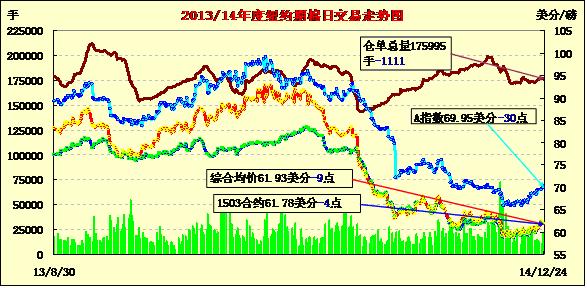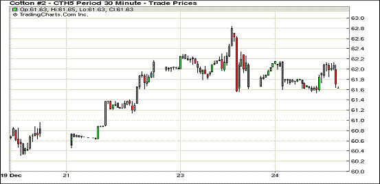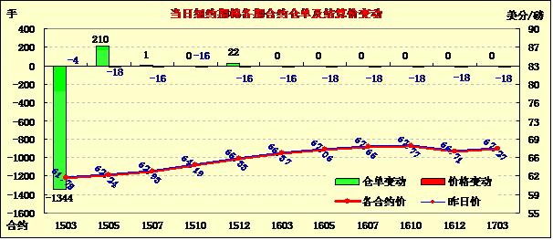 12月24日棉花市場消息面有限,紐約期棉普遍小幅下跌;主力3月合約收于61.78美分/磅,跌4點;1505月合約62.24美分/磅,跌18點。期棉當日開盤后先漲后跌,主力3月合約在62美分上下震蕩調(diào)整,盤終收于該點位下方小幅收跌,外部商品市場普遍收跌,市場成交量下滑。全球市場仍嚴重供應過剩,市場預計期棉仍將維持窄幅震蕩調(diào)整趨勢,同時全球和美棉下年度播種面積也將大幅減少。