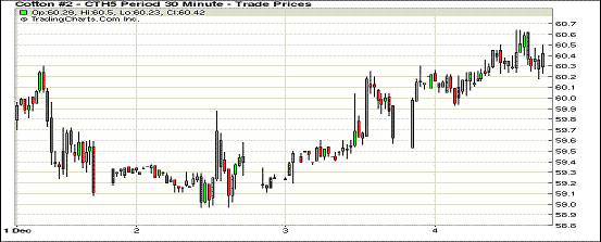 12月4日,紐約期棉連續(xù)三日收漲,近期12月合約結(jié)算價61.52美分/磅,漲51點;主力3月合約收于60.42美分/磅,漲78點。當日期棉高開高走,主力3月合約最高漲至60.64美分/磅,盤終站上60美分點位,其他合約漲幅均在百點以內(nèi);外部市場玉米和大豆上漲。11.21-11.27一周美國凈簽約出口本年度陸地棉37875噸,裝運24177噸;關(guān)注下周發(fā)布的USDA預(yù)測報告。