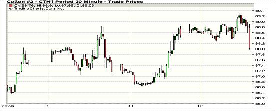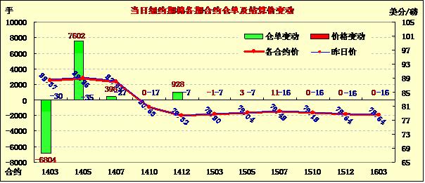 2月12日期棉先漲后跌,近期合約挑戰(zhàn)89美分/磅高點;主力3月合約結(jié)算價88.37美分/磅,跌30點;1405月合約收于88.85美分/磅,跌35點;1407月合約收于87.94美分/磅,跌27點。期棉高開低走,盤終各合約均小幅下跌,主力3月合約跌30點,震蕩區(qū)間88.25-89.31美分/磅,市場成交繼續(xù)放大,距離主力合約第一通知日還有6個交易日。
