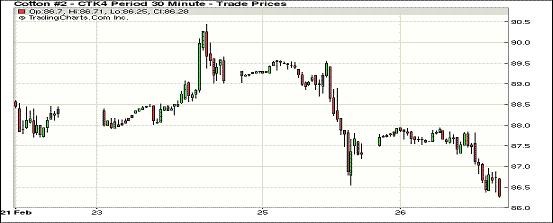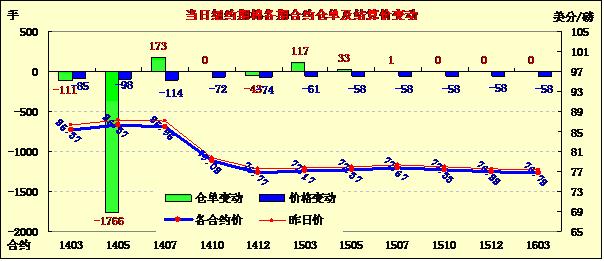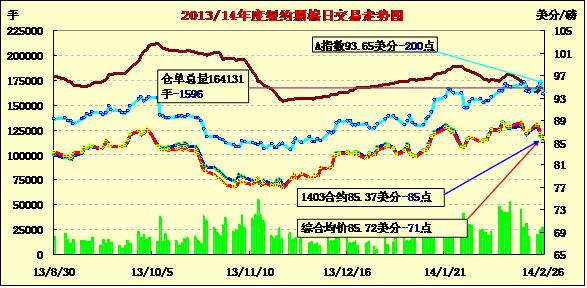 2月26日,投機賣盤打壓期棉連續(xù)第二個交易日收低,1403月合約結算價85.37美分/磅,跌85點;主力1405月合約結算價86.37美分/磅,跌98點;1407月合約結算價85.95美分/磅,跌114點。市場當日高開低走,主力5月合約上半場穩(wěn)定在87.5-88美分/磅;午盤后投機賣盤涌入打壓市場下跌,該合約盤終收于2月5日以來最低值,過去兩個工作日跌了近3個美分,自本周一的高點跌幅約4.5%。分析指出,此前因預計棉花供應緊張,投資人長時間建立了大量多頭頭寸,25日市場跌破趨勢線,引發(fā)大量止損賣單,同時投機賣盤進一步出脫倉位。市場關注將于今晚公布的新一期美棉出口周報。