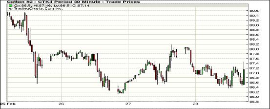2月28日,因投機(jī)者結(jié)清多頭頭寸,紐約期棉未能延續(xù)前一日漲勢(shì)多數(shù)合約回落,近期1403月合約收于86.59美分/磅,跌32點(diǎn);1405月合約結(jié)算價(jià)87.14美分/磅,跌67點(diǎn);1407月合約結(jié)算價(jià)86.89美分/磅,跌38點(diǎn)。市場(chǎng)交易量較前幾日明顯下降。當(dāng)日主力月合約開盤較為平穩(wěn),因擔(dān)心中國(guó)需求回落,期棉承壓下滑,該合約跌至當(dāng)日最低點(diǎn)86.36美分/磅,盤終有所反彈回補(bǔ)部分跌幅,盤終連續(xù)第二周收跌。本周1403月合約累計(jì)跌50點(diǎn),1405月合約累計(jì)跌121點(diǎn),1407月合約跌134點(diǎn),1412月跌32點(diǎn)。