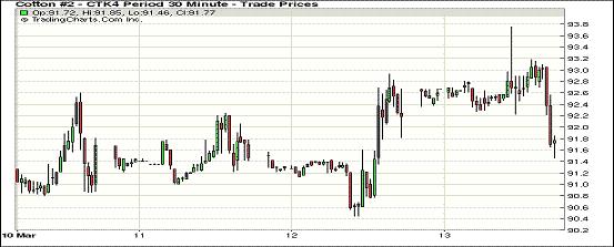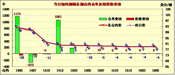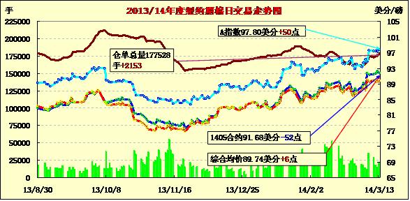 3月13日,美棉出口銷售數(shù)據(jù)回落打壓紐約期棉多數(shù)合約收跌,主力1405月合約結(jié)算價91.68美分/磅,跌51點(diǎn);1407月合約結(jié)算價89.86美分/磅,跌37點(diǎn)。當(dāng)日期棉高開,主力5月合約上半場在92.5美分/磅上下震蕩;午盤后一波買盤促棉價短暫上揚(yáng),該合約突破93美分至當(dāng)日最高點(diǎn)93.75美分/磅;然而美棉銷售數(shù)據(jù)不佳對市場形成壓力,該合約盤終未能延續(xù)漲勢掉頭下跌。據(jù)美國農(nóng)業(yè)部(USDA),2.28-3.6一周美國凈簽約出口本年度陸地棉13608噸(較前一周減62%,較近四周平均值減36%),裝運(yùn)59920噸(較前一周減27%,較近四周平均值減19%),銷售數(shù)據(jù)回落打壓棉價下滑。