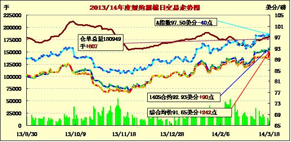 3月18日,紐約期棉繼續(xù)上漲,主力合約創(chuàng)新高。主力5月合約收于92.93美分/磅,漲90點;7月合約結(jié)算價92.08美分/磅,漲95點;1410月合約收于82.33美分/磅,漲20點。當(dāng)日期棉開盤后延續(xù)前幾日趨勢震蕩上行,盤終大幅上漲,收于92.93美分,為2012年2月13日93.10美分后高位;當(dāng)日玉米、小麥和大豆等商品期貨和美股均普遍大幅上漲。近期棉價持續(xù)上漲,除市場預(yù)期棉花供應(yīng)降低外,美棉預(yù)期播種面積減少同樣對棉價形成支撐。