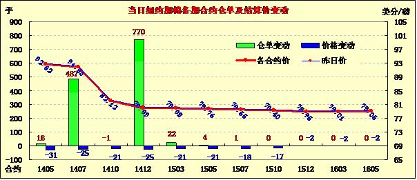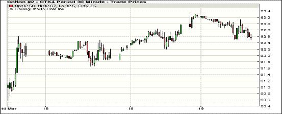3月19日,紐約期棉未能延續(xù)前一日漲勢,遠近合約均普遍下跌;主力5月合約結算價92.62美分/磅,跌31點;1407月合約收于91.83美分/磅,跌25點;1410月合約收于82.12美分/磅,跌21點。當日期棉開盤后普遍震蕩,盤終中幅下跌,主力5月合約持續(xù)下跌,震蕩區(qū)間92.48-93.29美分/磅;美棉銷售情況將決定棉價下一步走勢;外部商品市場小麥和大豆上漲,美股下跌。分析指出,19日期棉市場消息面平平,期棉自上周大幅上漲后缺乏下一步走向,關注今晚發(fā)布的美棉出口周報。