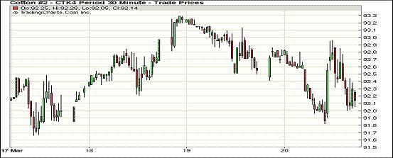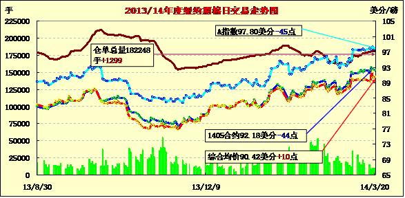 3月20日,紐約期棉延續(xù)前一日走勢繼續(xù)下跌。主力5月合約收于92.18美分/磅,跌44點;7月合約結(jié)算價91.77美分/磅,跌6點;1410月合約收于82.08美分/磅,跌4點。當日期棉開盤后普遍上漲,后持續(xù)震蕩,盤終近期合約收跌,主力合約連續(xù)四個交易日收于92美分以上。3.7-3.13一周美國凈簽約出口本年度陸地棉11521噸,裝運74616噸;中國凈簽約本年度陸地棉2064噸,裝運19527噸。