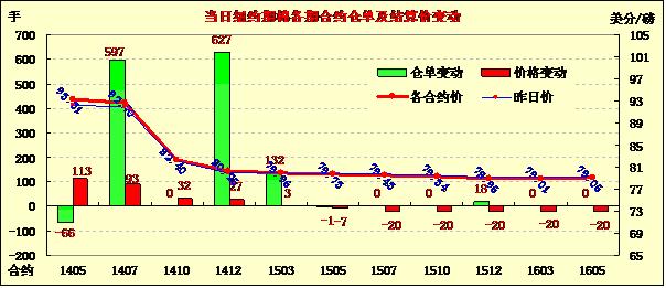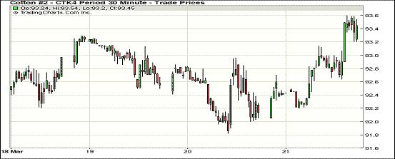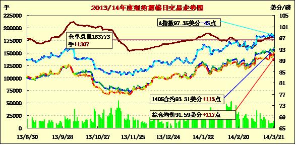 3月21日,紐約期棉近期合約大幅上漲,遠期合約普遍下跌;主力5月合約結算價93.31美分/磅,漲113點;7月合約結算價92.70美分/磅,漲93點;10月合約收于82.40美分/磅,漲32點。當日期棉延續(xù)近期漲勢,主力5月合約最高漲至93.60美分/磅(+142),收盤前回吐部分所得大幅上漲,1412合約漲至80美分以上,7/12月合約價差繼續(xù)拉大至1245點,市場成交量略有增加。