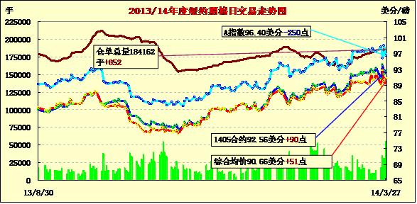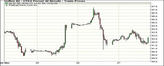 3月27日,紐約期棉近期合約收漲,遠(yuǎn)期合約略有下跌;主力5月合約結(jié)算價92.56美分/磅,漲90點(diǎn);7月合約結(jié)算價92.37美分/磅,漲101點(diǎn);10月合約收于81.49美分/磅,漲12點(diǎn)。經(jīng)過連續(xù)兩日寬幅震蕩后,27日棉價震蕩區(qū)間縮小,當(dāng)日早盤略有下跌,主力5月合約受市場買盤支撐上漲近百點(diǎn);市場成交較前一日的六周高值(56095手)大幅下降,1412月新花在80美分/磅以下徘徊。受各國政策消息影響,本周棉價大起大落;上周美國凈簽約出口本年度陸地棉15037噸,較前一周增31%,較近四周平均值減11%;裝運(yùn)58763噸,較前一周減21%,較近四周平均值減16%。