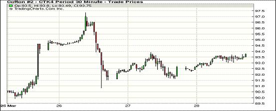 3月28日,紐約期棉繼續(xù)大幅上漲;主力5月合約結(jié)算價(jià)93.47美分/磅,漲118點(diǎn);7月合約結(jié)算價(jià)93.61美分/磅,漲124點(diǎn);10月合約收于82美分/磅,漲51點(diǎn)。期棉當(dāng)日開盤后普遍上漲,主力5月合約區(qū)間92.25-93.8美分/磅,盤終近期合約收漲超百點(diǎn),7/12月合約價(jià)差繼續(xù)放大至1368點(diǎn);市場(chǎng)成交量繼續(xù)縮小。據(jù)統(tǒng)計(jì),主力合約本周漲勢(shì)強(qiáng)勁,累計(jì)上漲311點(diǎn)。