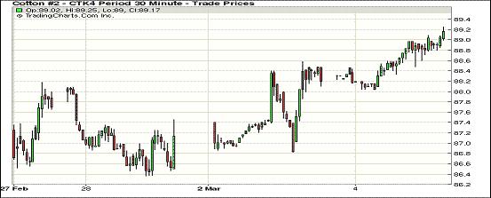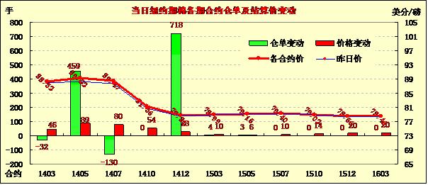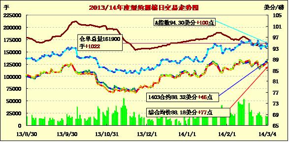 3月4日,受投機(jī)性買盤及外部市場(chǎng)和美股上漲帶動(dòng),紐約期棉繼續(xù)上漲。主力3月合約收于88.32美分/磅,漲46點(diǎn);5月合約結(jié)算價(jià)89.22美分/磅,漲89點(diǎn);1407月合約收于88.47美分/磅,漲80點(diǎn)。主力5月合約早盤漲幅一般,在89美分/磅以下震蕩向上,盤終前突破89美分收漲89點(diǎn);市場(chǎng)成交量一般。市場(chǎng)繼續(xù)等待中國方面發(fā)布棉花新政,導(dǎo)致棉花消息有限,抑制市場(chǎng)成交,美國道瓊斯指數(shù)大漲抵消前一日烏克蘭國內(nèi)危機(jī)負(fù)面消息影響;ICAC將2014/15年度全球期末庫存由此前預(yù)計(jì)的2081萬噸調(diào)增至2084萬噸。