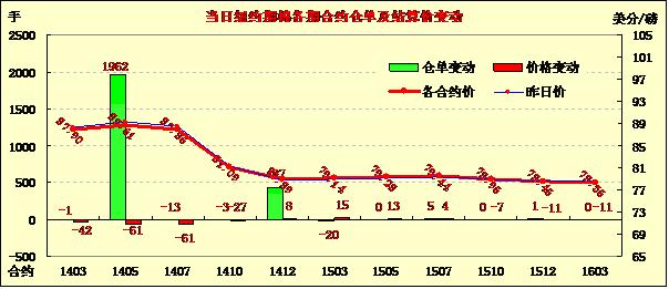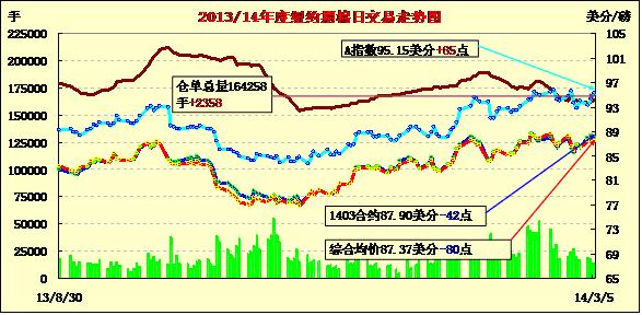 3月5日,市場(chǎng)對(duì)將于今晚公布的美棉出口數(shù)據(jù)預(yù)期不佳,此外ICAC月報(bào)預(yù)測(cè)14/15年度全球期末庫(kù)存繼續(xù)上升,這打壓紐約期棉全面回落,近期1403月合約結(jié)算價(jià)87.90美分/磅,跌42點(diǎn);主力1405月合約88.61美分/磅,跌61點(diǎn);1407月合約收于87.86美分/磅,跌61點(diǎn)。當(dāng)日主力5月合約連續(xù)第二日試探89美分/磅阻力位,早盤短暫震蕩在89.4-89.6美分/磅之間,后投機(jī)賣盤入場(chǎng)打壓棉價(jià)下行,下半場(chǎng)基本圍繞88.8美分震蕩,該合約在此前的兩個(gè)交易日期棉上漲幅度超過兩美分,當(dāng)日回落,本周以來交易量均處于低位。ICAC3月份月報(bào)預(yù)測(cè)對(duì)2013/14及2014/15年度的全球產(chǎn)消存數(shù)據(jù)調(diào)整幾無變化,2014/15年度全球期末庫(kù)存繼續(xù)上升,這對(duì)期末市場(chǎng)形成壓力。