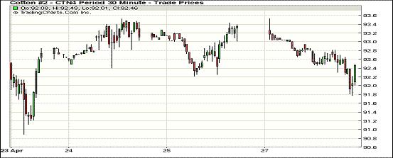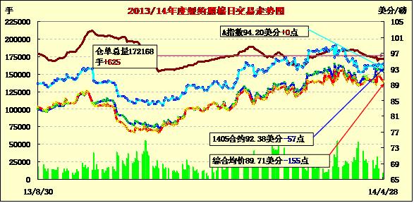 4月28日,紐約期棉漲跌互現(xiàn),近期5月合約結(jié)算價(jià)92.38美分/磅,跌57點(diǎn);主力1407月合約結(jié)算價(jià)92.23美分/磅,跌102點(diǎn);1412月合約收于82.74美分/磅,漲3點(diǎn)。當(dāng)日期棉市場(chǎng)平開低走,主力7月合約早盤在92.8美分/磅上下波動(dòng),午盤時(shí)分震蕩區(qū)間下滑至92.6美分/磅,尾盤獲利平倉(cāng)盤打壓市場(chǎng)繼續(xù)下跌,該合約跌至當(dāng)日最低點(diǎn)91.78美分,盤終雖略有反彈但仍跌幅過(guò)百。該合約目前受阻于93.50美分/磅壓力位,7/12月合約價(jià)差收窄至949點(diǎn),上周五為1054點(diǎn)。