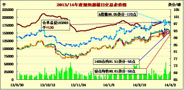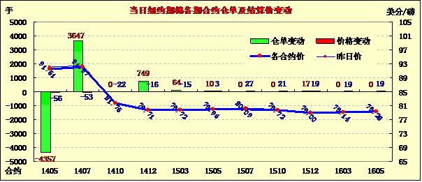 3月2日,受制于ICAC月報偏空及美棉下年度面積增長等因素,紐約期棉近月合約連續(xù)第三個交易日收跌,主力1405月合約結算價91.51美分/磅,跌56點;1407月合約結算價91.97美分/磅,跌53點。當日主力合約早盤平穩(wěn)上行,午盤前后至當日最高點92.98美分/磅,后ICAC月報利空拖累棉價下行,同時美棉面積增加繼續(xù)對市場形成打壓,該合約盤終收于近一周低點,并在3月26日以來首次收于92美分/磅之下。5/7月合約價差46點,較前一日拓寬3點;7/12月合約價差在1226點,較前一日走窄37點。ICAC最新預測,全球下年度消費減少10萬噸,期末庫存增加20萬噸至2104萬噸。此外USDA預測美棉14/15年度種植面積同比增7%繼續(xù)對棉價形成壓制。