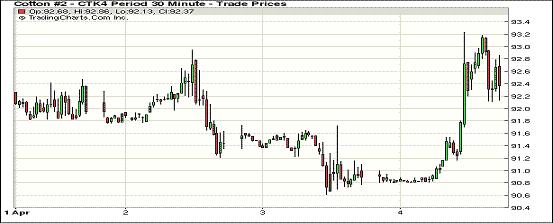 4月4日,因印度下年度產(chǎn)量減少消費(fèi)增加,紐約期棉價(jià)扭轉(zhuǎn)前四個(gè)交易日的弱勢(shì)大幅上揚(yáng),主力1405月合約結(jié)算價(jià)92.40美分/磅,漲142點(diǎn);1407月合約結(jié)算價(jià)92.67美分/磅,漲142點(diǎn)。當(dāng)日主力月合約早盤(pán)平穩(wěn)在91美分上下,下半場(chǎng)大量買(mǎi)盤(pán)入市促市場(chǎng)上揚(yáng),該合約當(dāng)日最高至93.23美分/磅,盤(pán)終略有回落但價(jià)格仍上揚(yáng)百余點(diǎn)。本周1405月合約累計(jì)跌134點(diǎn),于過(guò)去五周中首次收跌;1407月合約累計(jì)跌94點(diǎn)。有報(bào)道稱(chēng),印度2014/15年度棉花產(chǎn)量為2800萬(wàn)包,較本年度減100萬(wàn)包;消費(fèi)增加至2350萬(wàn)包;出口預(yù)計(jì)同比減25%,低于600萬(wàn)包。