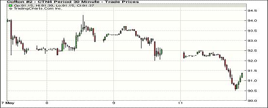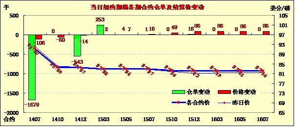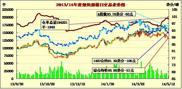 受外部商品市場下跌影響,12日紐約期棉市場2014年所有合約下滑;遠月合約保持穩(wěn)定。近期7月合約結算價91.30美分,跌幅過百,1412月合約結算價83.57美分,跌14點。當日受外圍大豆和玉米谷物期貨下行壓力,7月合約前大半個交易日呈下跌趨勢,在先后擊穿92美分和91美分后在90.5美分處獲得支撐反彈,最終收于91-91.5美分之間。從技術面看,隨機指數(shù)和RSI指標顯示7月合約仍有下行壓力,下一步關注89.5美分支撐位。