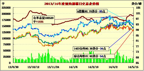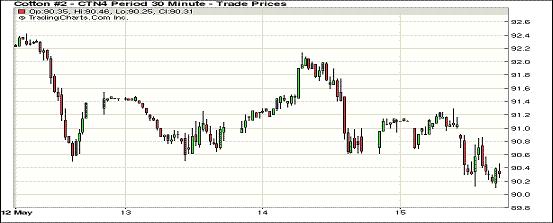 5月15日受美棉出口周報(bào)利空及外圍商品市場(chǎng)整體下跌影響,紐約期棉市場(chǎng)連續(xù)收跌,近期7月合約結(jié)算價(jià)90.36美分,跌34點(diǎn),1412月合約結(jié)算價(jià)82.62美分,跌26點(diǎn)。當(dāng)日7月合約早盤(pán)穩(wěn)定于91美分一線,盤(pán)中在90-91美分之間運(yùn)行。交易后期因美棉出口周報(bào)顯示前一周美棉出口狀況不盡人意,期棉靠近90美分,終收于近低點(diǎn)。外圍市場(chǎng)金屬和原油下跌,谷物期貨和棉花期貨同時(shí)受到影響整體下滑。據(jù)美國(guó)農(nóng)業(yè)部報(bào)告,前一周美國(guó)簽約出口棉花7711噸,較之前一周減少47%。