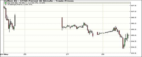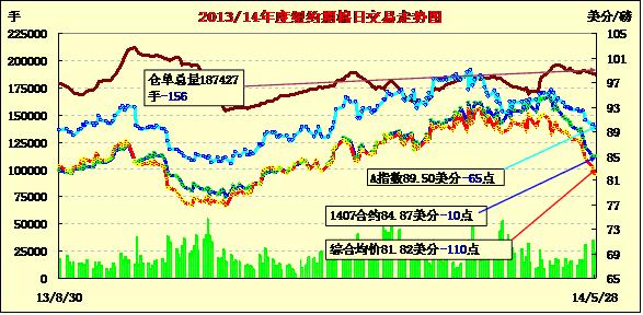 5月28日,由于美國(guó)德州旱情暫時(shí)緩解,紐約期棉持續(xù)下跌,跌幅較前一日縮?。?月合約結(jié)算價(jià)84.87美分/磅,跌10點(diǎn);1410月合約收于77.67美分/磅,跌22點(diǎn);1412月合約收于77.72美分/磅,跌14點(diǎn)。當(dāng)日期棉開盤后持續(xù)低位震蕩,一度跌破84美分/磅關(guān)點(diǎn),12月合約震蕩區(qū)間97點(diǎn),期棉已連續(xù)四日下跌。據(jù)USDA,美棉播種率已達(dá)62%,較前一周增16個(gè)百分點(diǎn),僅落后于五年均值2個(gè)百分點(diǎn),同比明顯加快。