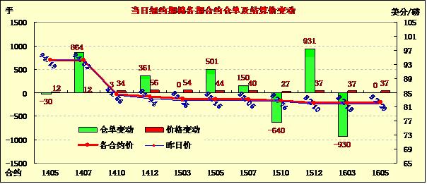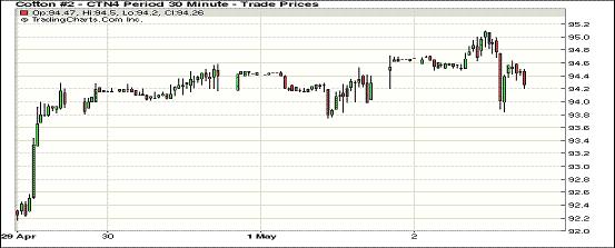 5月2日,紐約期棉全面收漲,1405月合約結(jié)算價94.19美分/磅,漲12點;主力1407月合約結(jié)算價94.32美分/磅,漲12點;遠期1412月收于83.94美分/磅,漲56點。當日主力1407月合約早盤短暫在94.6美分/磅震蕩,后波動區(qū)間上移至94.8美分,午盤后至當日最高點95.10美分/磅,為3月26日以來最高,下半場買盤獲利平倉回吐部分漲幅,盤終該合約微幅收漲。本周1407月合約累計漲107點,為連續(xù)第三周走高;1412月合約漲123點,為連續(xù)第四周收漲。