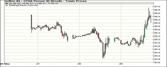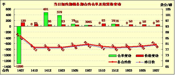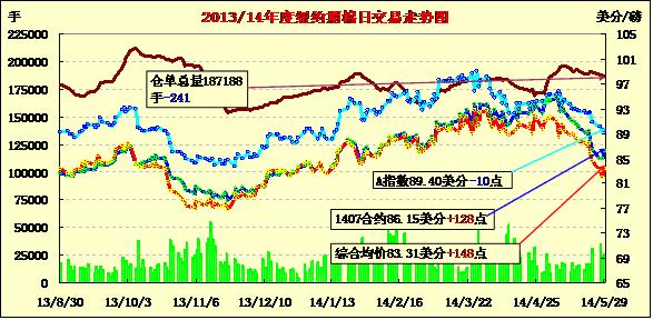 5月29日,受市場(chǎng)投資者買盤拉動(dòng),紐約期棉止跌反彈,遠(yuǎn)近合約普遍上漲;7月合約結(jié)算價(jià)86.15美分/磅,漲128點(diǎn);1410月合約收于78.32美分/磅,漲65點(diǎn);1412月合約收于78.38美分/磅,漲66點(diǎn)。當(dāng)日期棉開盤后普遍上漲,此前四連跌累計(jì)下跌442點(diǎn),午盤后主力合約漲勢(shì)明顯,達(dá)到86.94美分/磅高點(diǎn),7/12月合約價(jià)差777點(diǎn)。預(yù)計(jì)美棉供應(yīng)量在年底前仍將持續(xù)吃緊,關(guān)注今晚發(fā)布的美棉出口周報(bào)。