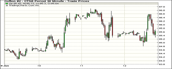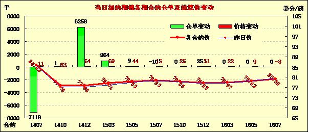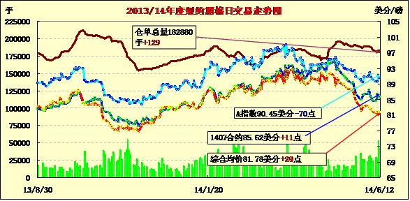 6月12日,受美棉出口數(shù)據(jù)利好支持,紐約期棉遠近合約小幅上漲;7月合約結(jié)算價85.62美分/磅,漲11點;10月合約結(jié)算價77.73美分/磅,漲63點;1412月合約收于77.83美分/磅,漲64點。
