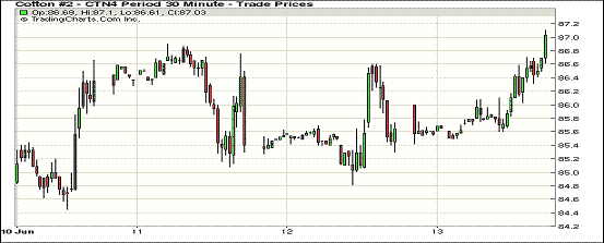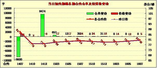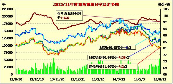 6月13日,紐約期棉除主力1412月合約外普遍收漲,近期1407月合約結算價86.98美分/磅,漲136點;1410月合約結算價77.75美分/磅,漲2點;主力1412月合約收于77.75美分/磅,跌8點。當日近期7月合約平開高走,上半場在85.8美分/磅一線波動,下半場受買盤支持一路上揚,盤終收于6月3日以來最高值。本周1407月合約累計漲220點,1412月合約累計跌25點。