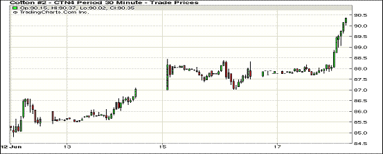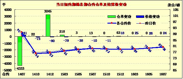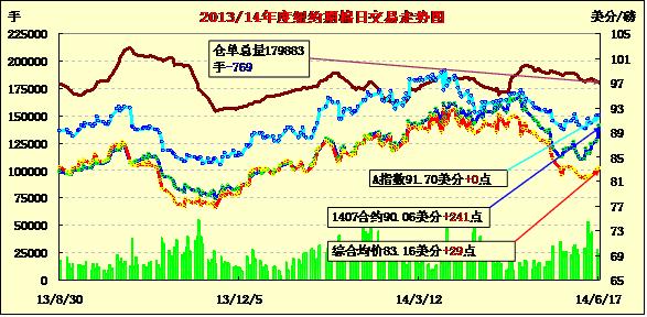 6月17日,紐約期棉漲跌互現(xiàn),主力1412月合約結(jié)算價76.32美分/磅,跌80點(diǎn);1410月合約結(jié)算價75.94美分/磅,跌73點(diǎn);近期1407月合約收于90.06美分/磅,漲241點(diǎn)。當(dāng)日1407月合約平穩(wěn)開盤后大部分時段平穩(wěn)在88美分/磅一線,交易后半場買盤入市促該合約急速上揚(yáng),盤終收于5月15日以來最高值。德州利好天氣打壓1412月合約三連跌,當(dāng)日收于2013年11月以來最低值。因預(yù)報(bào)稱美國最大產(chǎn)棉區(qū)德州將迎來更多利好降雨,市場對新年度美棉增產(chǎn)的預(yù)期升溫對1412月合約形成打壓;當(dāng)日1407月合約大漲,很可能是將有大量合約交割的證據(jù),這鞏固了對近月棉花供應(yīng)緊張的擔(dān)憂。