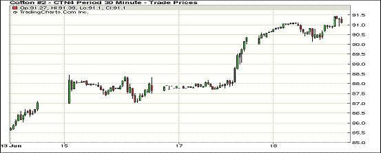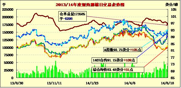 6月18日,紐約期棉全面收漲,主力1412月合約結(jié)算價(jià)77.19美分/磅,漲87點(diǎn);1410月合約結(jié)算價(jià)77.20美分/磅,漲126點(diǎn);近期1407月合約收于91.15美分/磅,漲109點(diǎn)。受空頭回補(bǔ)買盤支持,1407月合約當(dāng)日高位運(yùn)行,于5月15日以來首次突破91美分,當(dāng)日最高至91.43美分/磅,盤終連續(xù)第六個(gè)交易日收漲,并收于5月12日以來最高值。12月合約7/12月合約價(jià)差當(dāng)日維持在14美分左右。
