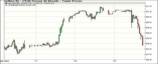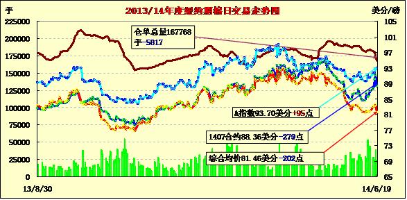 因新一期出口周報(bào)顯示美棉2014/15年度棉花銷售乏善足陳,抵消了當(dāng)前年度棉花銷售強(qiáng)勁,且交易商結(jié)清7月合約頭寸也拖累市場(chǎng),6月19日紐約期棉未能延續(xù)前一日漲勢(shì)全面下滑,主力1412月合約結(jié)算價(jià)77.13美分/磅,跌6點(diǎn);1410月合約結(jié)算價(jià)76.81美分/磅,跌39點(diǎn);近期1407月合約收于88.36美分/磅,跌279點(diǎn)。1407月棉花合約下周進(jìn)入交割通知期(7月9日到期),交易商紛紛在合約到期前結(jié)清頭寸拖累該合約大幅下跌,盤中下挫超過3美分,盤終較前一日收低3.1%。12月合約當(dāng)日運(yùn)行較為平穩(wěn),盤終略有回落。當(dāng)日外部谷物及原油市場(chǎng)收漲。新一期美棉出口周報(bào)顯示,盡管當(dāng)前2013/14銷售年度棉花銷售優(yōu)于市場(chǎng)預(yù)期,但2014/15作物年度棉花銷售令人失望。