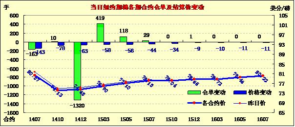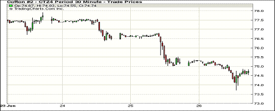 6月26日受美棉出口銷售數(shù)據(jù)疲軟影響,紐約期棉整體繼續(xù)走低,主力1412月合約結算價74.63美分/磅,跌63點;1410月合約結算價74.12美分/磅,跌78點;近期1407月合約收于80.37美分/磅,跌143點。當日主力1412月合約大部分時間圍繞75美分/磅一線波動,后美棉出口周報公布打壓該合約下滑至當日最低點73.71美分/磅;尾盤時分略有反彈回補部分跌幅,盤終中幅收跌。