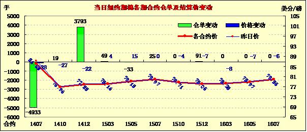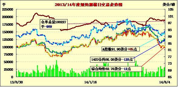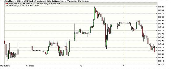 6月4日,因預(yù)報(bào)稱美國最大產(chǎn)棉區(qū)德州將迎來利好降雨,同時(shí)市場擔(dān)憂USDA將于今晚公布的美棉周度出口數(shù)據(jù),紐約期棉結(jié)束過去四個(gè)交易日連續(xù)上漲的局面掉頭收跌,主力1407月合約結(jié)算價(jià)86.08美分/磅,跌128點(diǎn);1412月合約收于77.88美分/磅,跌27點(diǎn)。當(dāng)日期棉略有高開,主力7月合約上半場圍繞87.4美分/磅震蕩;午盤后利空消息主導(dǎo)市場,該合約一路下滑至盤終,錄得一周來最大單日跌幅,且抹去了過去四日的半數(shù)漲幅。當(dāng)日外部大豆及小麥?zhǔn)袌鍪諠q,玉米及原油期貨走低。