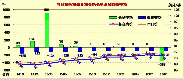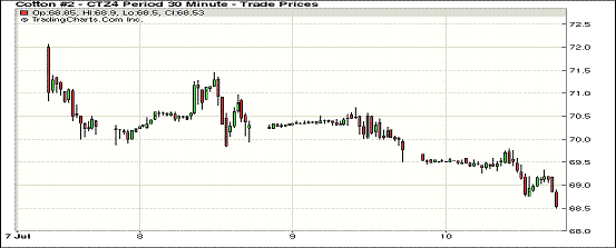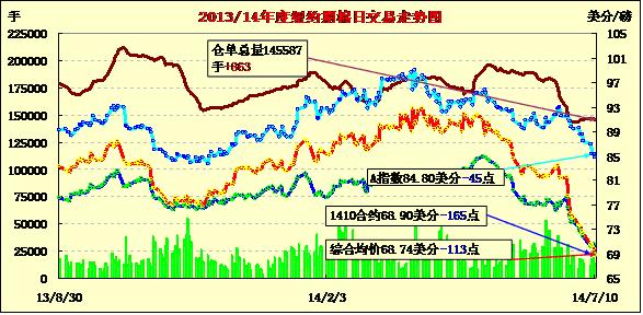 7月10日,紐約期棉再度大幅下跌,主力合約再創(chuàng)新低;10月合約結(jié)算價68.90美分/磅,跌165點;1412月合約收于68.55美分/磅,跌112點。當(dāng)日期棉低開低走,主力12合約在過去12個交易日里11日下跌,跌至68.55美分/磅新低;外部谷物市場玉米和大豆下跌,美元指數(shù)下跌。由于市場缺乏投資者買盤,本周期棉延續(xù)近期走勢連續(xù)下挫,市場關(guān)注今日發(fā)布的USDA產(chǎn)量報告,市場預(yù)計棉價仍有進一步下行空間;6.27-7.3一周美國凈簽約出口本年度陸地棉15331噸,裝運30935噸。 當(dāng)周中國凈簽約本年度陸地棉794噸,裝運8323噸。