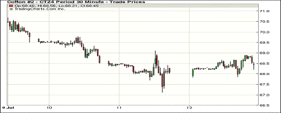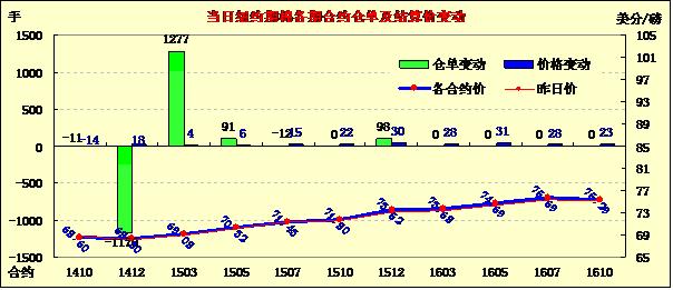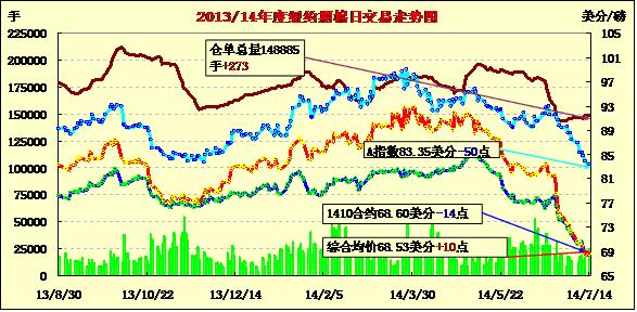 7月14日,紐約期棉除近期10月合約下跌外,其他合約均小幅上漲;10月合約結(jié)算價68.60美分/磅,跌14點;1412月合約收于68.30美分/磅,漲18點。由于市場利空消息紛紛兌現(xiàn),買家買盤令期棉止跌回穩(wěn),當(dāng)日期棉開盤后普遍上漲,主力12合約結(jié)束6月27日以來持續(xù)下跌走勢,盤終小幅收漲18點,后市有望反彈;外部谷物市場和油籽期貨上漲。