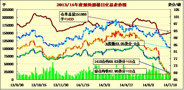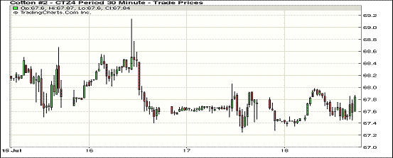 7月18日市場(chǎng)消息面平平,期棉近漲遠(yuǎn)跌;10月合約結(jié)算價(jià)68.63美分/磅,漲18點(diǎn);主力12月合約收于67.74美分/磅,漲9點(diǎn)。當(dāng)日期棉開(kāi)盤(pán)后繼續(xù)震蕩下行,主力合約最高漲至67.98美分/磅,盤(pán)終小幅收漲;外部市場(chǎng)玉米和大豆下跌。