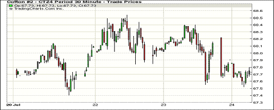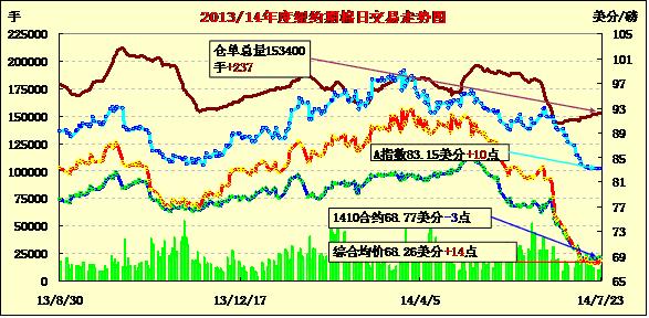 7月23日,市場預(yù)期今晚發(fā)布的美棉出口數(shù)據(jù)強(qiáng)勁,期棉小幅上漲;10月合約結(jié)算價(jià)68.77美分/磅,跌3點(diǎn);1412月合約收于68.08美分/磅,漲17點(diǎn)。當(dāng)日期棉開盤后先漲后跌,主力12月合約盤終前由68.40美分/磅高位跌至68美分以上,小幅收漲17點(diǎn),市場成交量較前一日減少;外部商品市場大豆上漲。盡管市場仍預(yù)期美棉產(chǎn)量上升,短期美棉銷售數(shù)據(jù)利好對棉價(jià)形成暫時(shí)支撐,USDA8月份預(yù)測報(bào)告發(fā)布在即,預(yù)計(jì)棉價(jià)仍將繼續(xù)走低。