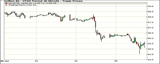 7月25日,紐約期棉延續(xù)近期弱勢繼續(xù)收跌;10月合約結(jié)算價65.16美分/磅,跌124點(diǎn);主力12月合約65.35美分/磅,跌70點(diǎn)。當(dāng)日期棉開盤后延續(xù)前一日走勢不斷下滑,主力合約最低跌至64.53美分/磅,盤終略有反彈仍收跌70點(diǎn),外部市場玉米和小麥上漲。全球及美棉預(yù)期供過于求和高庫存仍對棉價形成打壓,預(yù)計(jì)棉價下一個關(guān)口在60美分/磅附近。