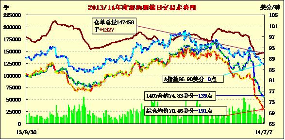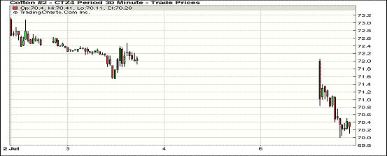 7月7日,美棉新花生長良好及預(yù)期產(chǎn)量上升持續(xù)對(duì)棉價(jià)形成打壓,期棉大幅收跌;7月合約結(jié)算價(jià)74.83美分/磅,跌139點(diǎn);10月合約結(jié)算價(jià)70.23美分/磅,跌156點(diǎn);1412月合約收于70.21美分/磅,跌185點(diǎn)。 當(dāng)日期棉開盤后繼續(xù)承壓下行,主力12合約跌幅明顯,震蕩區(qū)間70-72.06美分/磅,盤終收跌近200點(diǎn);外部市場(chǎng)谷物及油籽期貨收跌。市場(chǎng)預(yù)期USDA7月份月報(bào)上調(diào)美棉產(chǎn)量,棉價(jià)繼續(xù)承壓,預(yù)計(jì)棉價(jià)仍有下跌空間。