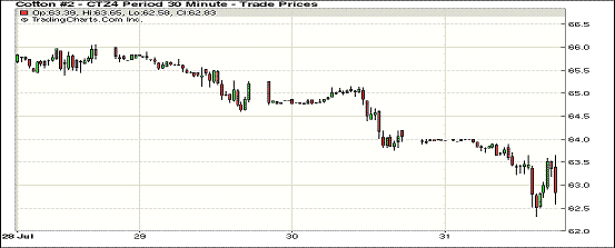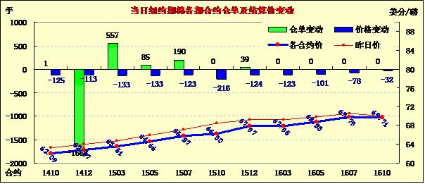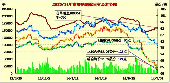 7月最后一個交易日,因庫存憂慮蓋過出口數(shù)據(jù)強勁,紐約期棉連續(xù)第三個交易日走低,近期1410月合約結(jié)算價62.09美分/磅,跌125點;主力1412月合約結(jié)算價62.87美分/磅,跌113點;其他遠期合約跌幅78-216點不等。當日主力合約上半場基本穩(wěn)定在63.5美分/磅,美棉出口數(shù)據(jù)利好并未對市場產(chǎn)生影響,庫存壓力打壓該合約下半場下滑至當日最低點61.90美分/磅,盤終收跌百余點。該合約7月份累計跌1064點,跌幅14.5%;過去兩個月累計大跌33%。紐期登記庫存本月較少318924包,為1月份以來最低值。分析指出,期棉穩(wěn)步下滑,因上月美國農(nóng)業(yè)部稱,預期2014/15年度末美棉庫存將升至約500萬包的六年高位,全球棉花庫存將增至約1.06億包的紀錄高位。