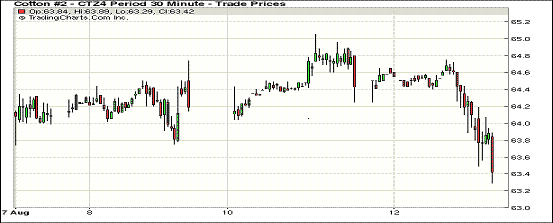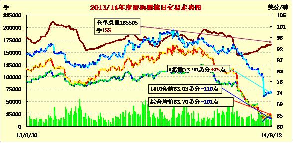 8月12日,受USDA月報(bào)利空影響,紐約期棉結(jié)束過去兩個(gè)交易日小漲的局面掉頭收跌,近期1410月合約結(jié)算價(jià)63.03美分/磅,跌110點(diǎn);主力1412月合約結(jié)算價(jià)63.37美分/磅,跌103點(diǎn);遠(yuǎn)期1503月合約收于64.22美分/磅,跌107點(diǎn)。當(dāng)日主力12月合約早盤基本在64.4-64.6美分/磅之間震蕩;后USDA月報(bào)數(shù)據(jù)利空導(dǎo)致投機(jī)空頭入市,期棉下半場呈回落態(tài)勢,該合約盤終錄得一周半以來最大單日跌幅。昨晚公布的USDA月報(bào)預(yù)期2014/15年度美棉產(chǎn)量將達(dá)1750萬包,為四年高位,這抵消了其對全球消費(fèi)預(yù)估帶來的提振,令期棉價(jià)格在整個(gè)交易日承壓。