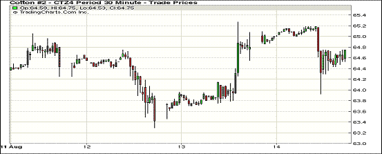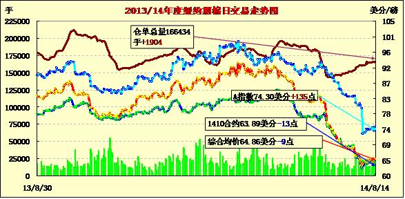 8月14日,因新一期美棉出口銷(xiāo)售數(shù)據(jù)疲弱,紐約期棉各合約掉頭收跌,近期1410月合約結(jié)算價(jià)63.89美分/磅,跌13點(diǎn);主力1412月合約結(jié)算價(jià)64.67美分/磅,跌5點(diǎn);遠(yuǎn)期1503月合約收于65.47美分/磅,跌2點(diǎn)。市場(chǎng)成交量持續(xù)清淡。當(dāng)日主力12月合約早盤(pán)在65-65.2美分/磅之間區(qū)委震蕩;后受USDA出口周報(bào)數(shù)據(jù)不佳打壓回落,午盤(pán)后至當(dāng)日最低點(diǎn)63.92美分/磅;此時(shí)投機(jī)買(mǎi)盤(pán)入市促該合約反彈,尾盤(pán)圍繞64.6美分波動(dòng),盤(pán)終微幅收跌。當(dāng)日外部股市及商品市場(chǎng)普遍走高。據(jù)USDA,8.1-8.7一周美國(guó)凈簽約出口本年度陸地棉40007噸;凈簽約本年度皮馬棉748噸。分析師指出,盡管價(jià)格跌至近五年低位,但買(mǎi)家的興趣仍驟降,導(dǎo)致銷(xiāo)售數(shù)據(jù)疲弱。