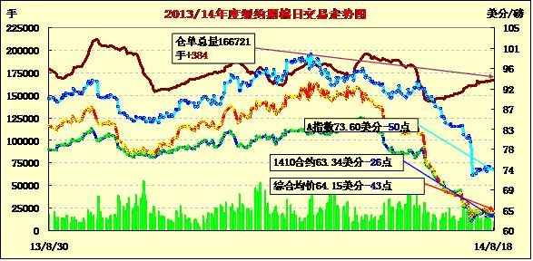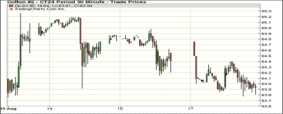 8月18日,因市場對中國需求產(chǎn)生擔憂,紐約期棉連續(xù)第三個交易日收跌,近期1410月合約結(jié)算價63.34美分/磅,跌26點;主力1412月合約結(jié)算價63.84美分/磅,跌51點;遠期1503月合約收于64.74美分/磅,跌51點。當日開盤較為平穩(wěn),主力12月合約基本在63.8-64.4美分/磅區(qū)間震蕩,中國需求擔憂打壓市場在下半場逐漸下滑,盤終三連跌。該合約自8月1日以來一直在62.00-66美分/磅之間徘徊。據(jù)海關(guān)統(tǒng)計,中國7月份進口棉花28.03萬噸,較上月增長28.4%,但同比減少17%,這引發(fā)市場對中國需求的擔憂,同時上周USDA預(yù)測美國棉花產(chǎn)量將達到四年高位,投機客看空期棉市場。