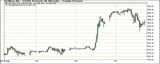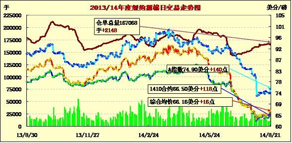 8月21日,紐約期棉各合約漲跌互現(xiàn),近期1410月合約結(jié)算價(jià)66.50美分/磅,漲118點(diǎn);主力1412月合約結(jié)算價(jià)65.92美分/磅,漲11點(diǎn);遠(yuǎn)期1503月合約收于66.42美分/磅,跌9點(diǎn);其他遠(yuǎn)期合約跌幅在14-17點(diǎn)間。市場(chǎng)成交量較前一日回落。當(dāng)日市場(chǎng)小幅高開,主力12月合約早盤圍繞66.5美分/磅震蕩;午盤后回落至66美分上下,盤終微幅上漲。德州天氣干燥推高近期10月合約價(jià)格,該合約收漲百余點(diǎn)。據(jù)USDA,8.8-8.14一周美國(guó)凈簽約出口本年度陸地棉35290噸,其中中國(guó)凈簽約15536噸,周報(bào)數(shù)據(jù)當(dāng)日對(duì)期棉市場(chǎng)影響不大。