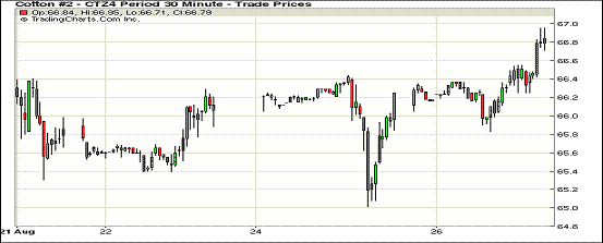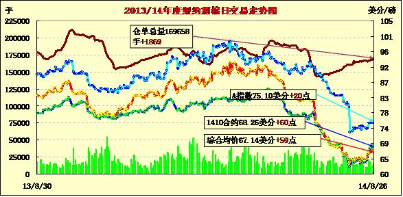 8月26日,受紡企買盤及貿(mào)易商空頭回補支持,紐約期棉全面收漲,近期1410月合約結(jié)算價68.26美分/磅,漲60點;主力1412月合約結(jié)算價66.89美分/磅,漲74點;遠(yuǎn)期1503月合約收于67.24美分/磅,漲61點;其他遠(yuǎn)期合約漲幅在61-63點之間。當(dāng)日市場平穩(wěn)開盤,主力合約早盤短暫在66.2-66.4美分/磅之間震蕩,回落至當(dāng)日最低位65.83美分/磅后止損買盤入市,促該合約在下半場持續(xù)反彈,盤終收于7月23日以來最高值,并于5月22日以來首次收于40日移動平均線之上。