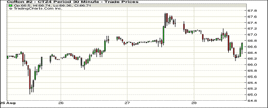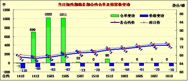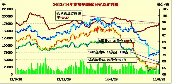 8月28日,雖然新一期美棉出口銷(xiāo)售數(shù)據(jù)利好,但美國(guó)主產(chǎn)棉區(qū)將迎降雨緩解供應(yīng)憂慮,此消息打壓紐約期棉全面回落,近期1410月合約結(jié)算價(jià)67.14美分/磅,跌116點(diǎn);主力1412月合約結(jié)算價(jià)66.58美分/磅,跌88點(diǎn);遠(yuǎn)期1503月合約收于67.18美分/磅,跌63點(diǎn)。當(dāng)日主力合約早盤(pán)短暫在67.1美分/磅停留后,震蕩區(qū)間滑落至66.8-66.9美分一線;美棉出口利好促該合約漲至當(dāng)日最高點(diǎn)67.44美分/磅之間;后降雨消息打壓市場(chǎng)回落,同時(shí)技術(shù)性賣(mài)盤(pán)施壓,該合約終以陰跌收盤(pán)。據(jù)USDA,8.15-8.21一周美國(guó)凈簽約出口本年度陸地棉56177噸,該數(shù)據(jù)令人鼓舞,但在當(dāng)日并未對(duì)市場(chǎng)產(chǎn)生影響。