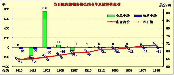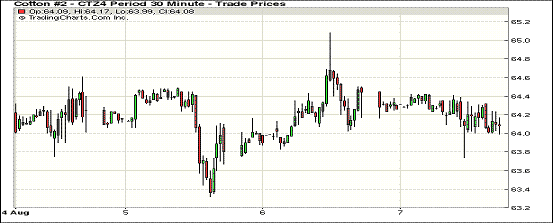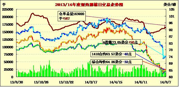 8月7日,受外部股市及商品市場整體走低拖累,紐約期棉未能延續(xù)前一日漲勢普遍回落,近期1410月合約結(jié)算價(jià)63.57美分/磅,跌40點(diǎn);主力1412月合約結(jié)算價(jià)64.02美分/磅,跌33點(diǎn);遠(yuǎn)期1503月合約收于64.83美分/磅,跌30點(diǎn)。市場交投繼續(xù)清淡,預(yù)計(jì)此情況將持續(xù)到USDA公布8月份月度供需報(bào)告。當(dāng)日公布的美棉出口周報(bào)基本未對(duì)市場產(chǎn)生影響,主力12月合約上半場圍繞64.3美分/磅波動(dòng);午盤后滑落至當(dāng)日最低點(diǎn)63.74美分;尾盤在64.1美分上下徘徊,盤終小幅下跌。