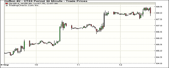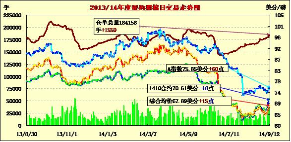 9月12日,紐約期棉漲跌互現(xiàn),主力合約小幅下跌;1410月合約結(jié)算價(jià)70.61美分/磅,跌18點(diǎn);主力1412月合約結(jié)算價(jià)68美分/磅,跌9點(diǎn);遠(yuǎn)期1503月合約收于67.43美分/磅,漲47點(diǎn)。當(dāng)日期棉開(kāi)盤(pán)后普遍上漲,主力合約最高漲至68.48美分/磅,后在48美分以上震蕩,盤(pán)終小幅收跌,該合約本周累計(jì)上漲369點(diǎn)。