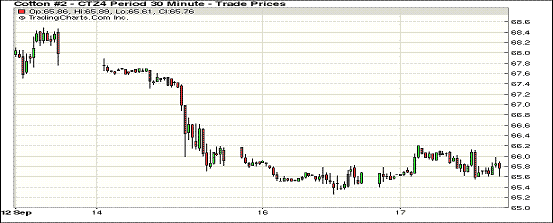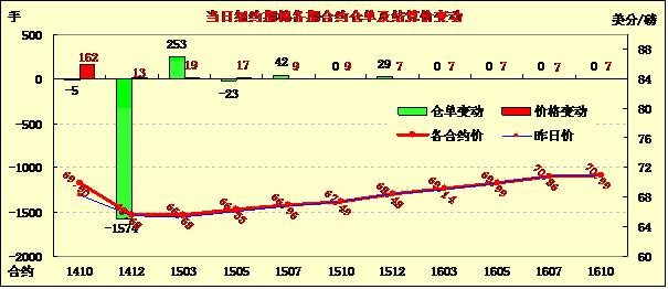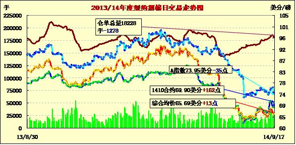 9月17日,紐約期棉結(jié)束跌勢整體反彈,近期合約漲幅明顯;1410月合約結(jié)算價69.90美分/磅,漲162點;主力1412月合約結(jié)算價65.68美分/磅,漲13點;遠(yuǎn)期1503月合約收于65.58美分/磅,漲19點。當(dāng)日早盤期棉小幅下跌,后略有反彈,盤終近期10月合約大幅上漲超百點,主力合約及遠(yuǎn)期合約均小幅上漲,12/3月價差縮至10點。美國主產(chǎn)區(qū)德州西部近期天氣條件對新花生長不利,新花質(zhì)量可能因此降低;關(guān)注今晚發(fā)布的美棉出口周報。